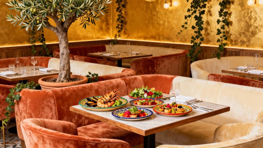 Interior of a new Mediterranean restaurant with food.
