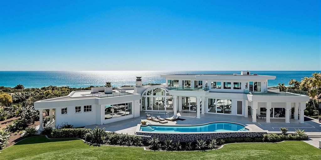 Designed to maximize breathtaking ocean and bay vistas, every room in this five-bedroom, seven-bathroom residence offers spectacular views. A significant feature is the expansive multi-level terrace, which includes an infinity-like pool that appears to merge with the ocean horizon, creating a seamless connection between the living space and the sea.