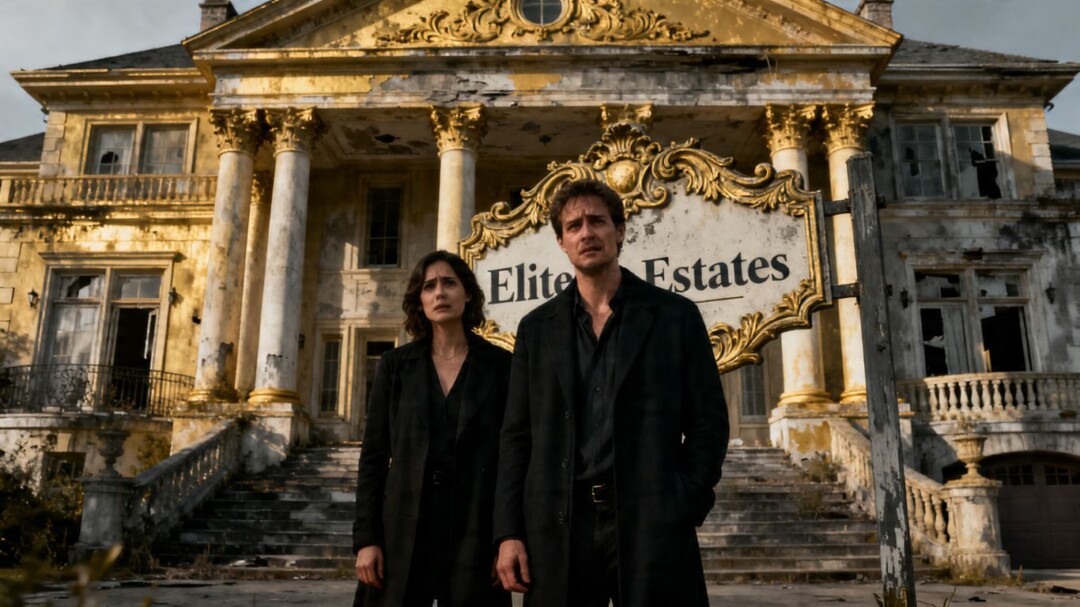 Couple in front of mansion, real estate sign visible.