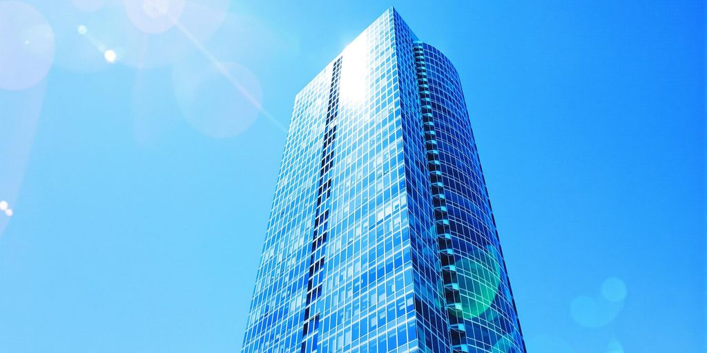 Modern glass office building against a clear sky.
