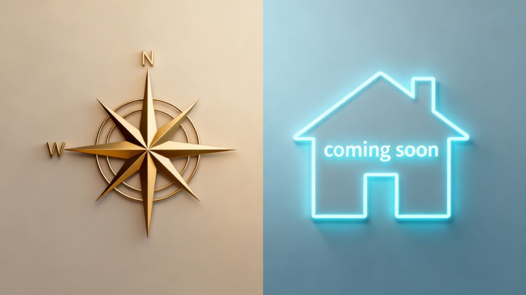 Compass and house silhouette with 'coming soon' glow.