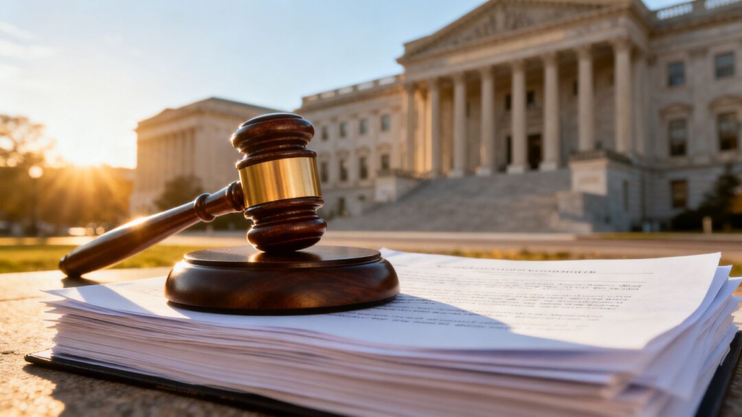 Gavel on documents with legislative building background.