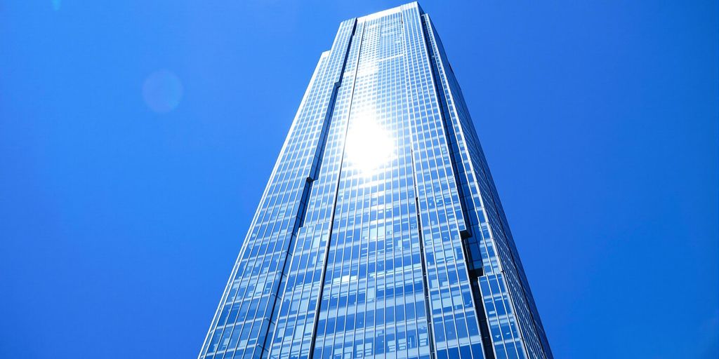 Modern skyscraper exterior reflecting sunlight.