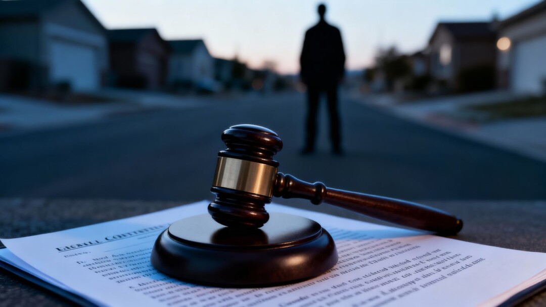 Gavel on legal document, shadowy figure on street.