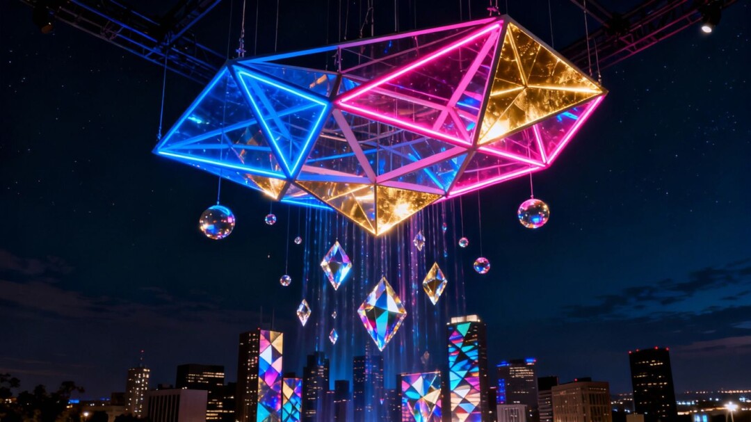 Illuminated art installation hangs in Miami's night sky.