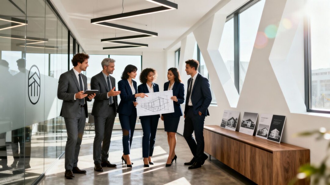 Real estate agents collaborating in a modern office.