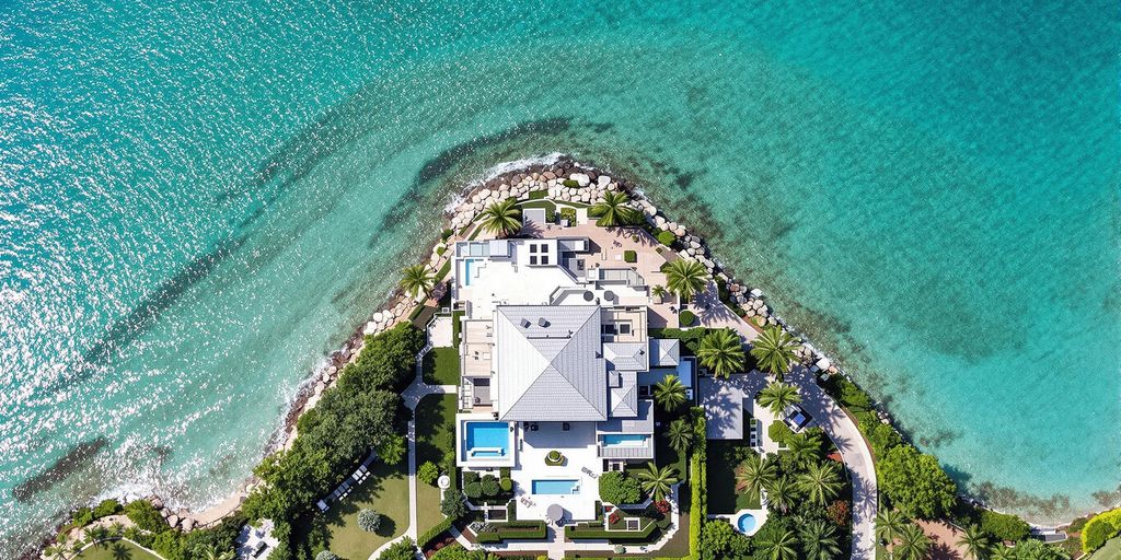 Sunny Miami waterfront mansion with pristine blue ocean.