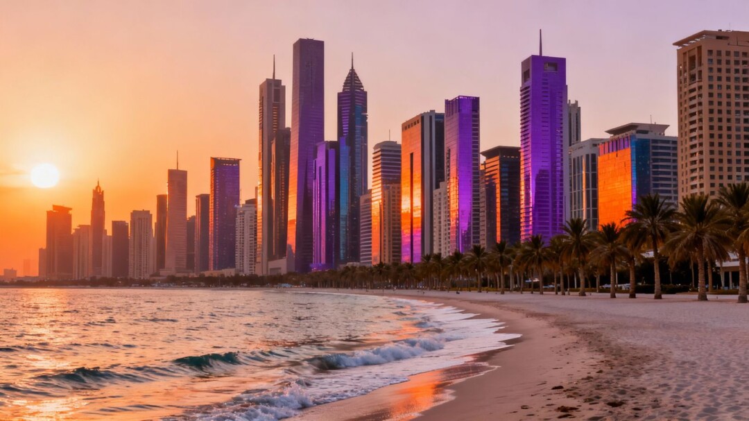 South Florida skyline with palm trees and ocean.