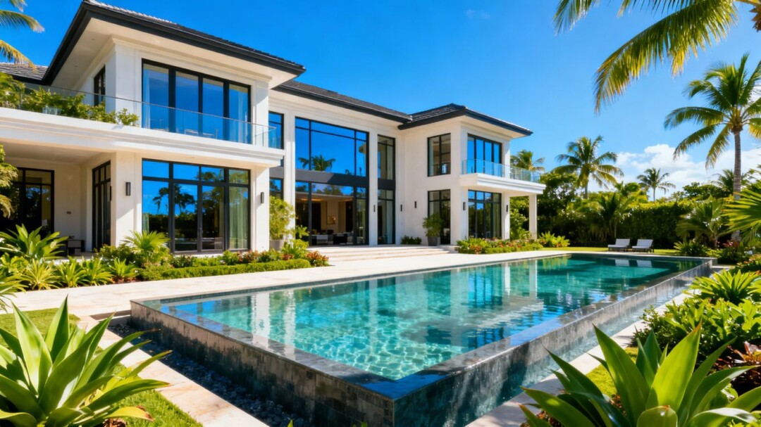 Luxury South Florida mansion with pool and palm trees.