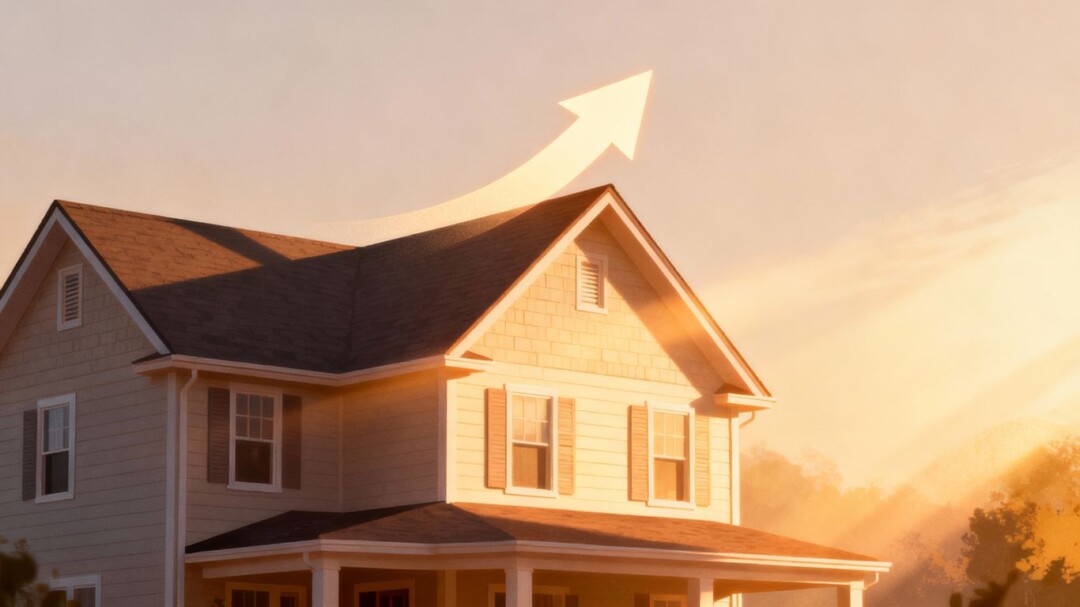 House with upward arrow, mortgage rates near lows.