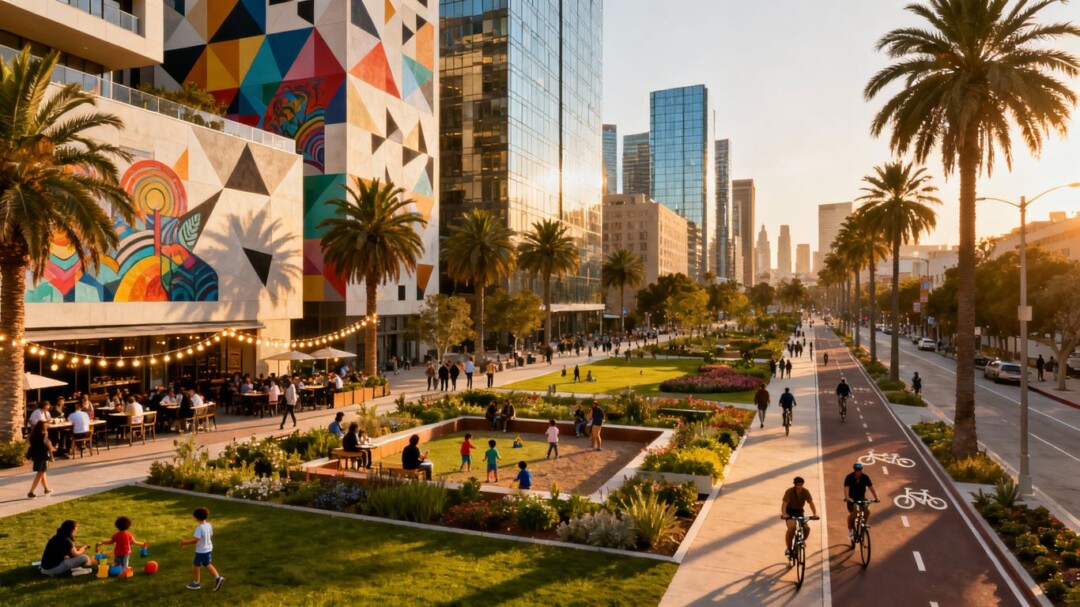 Wynwood cityscape with modern buildings and people enjoying outdoor spaces.